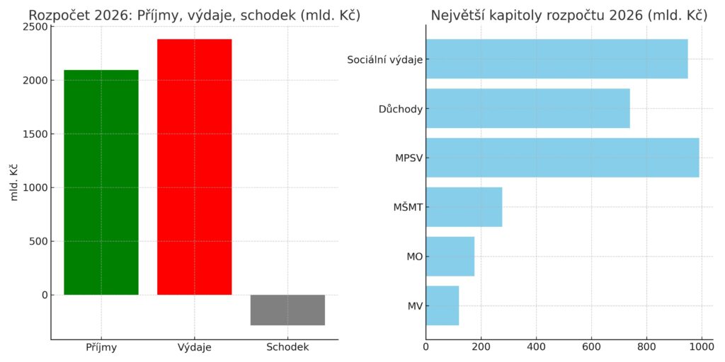 Ministerstvo financí v neděli večer poslalo vládě k projednání návrh státního rozpočtu na rok 2026. Podle předloženého dokumentu mají být celkové výdaje státu 2380,3 miliardy korun, příjmy 2094,3 miliardy. Výsledkem je schodek 286 miliard korun. Pokud by se nezapočítaly mimořádné výdaje na obranu a jadernou energetiku v objemu 49 miliard, deficit by byl nižší – 237 miliard korun, což by znamenalo meziroční zlepšení o čtyři miliardy proti letošnímu schválenému rozpočtu.